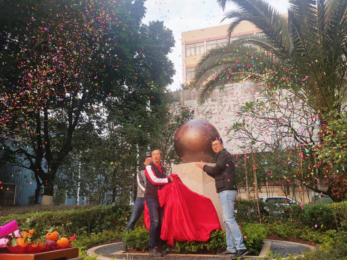 随着礼炮声和掌声欢呼声的响起,承安的董事长周腾芳先生、总经理周建新先生、副总经理岑国明先生揭开了覆盖着这颗直径1米的大铜球的红布,承安的新地标“威士顿金球”正式落成。